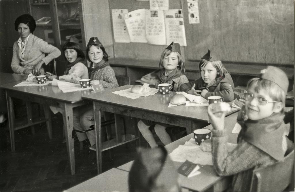 Po proslavi in častni zaprisegi pod pionirsko zastavo je sledila zaslužena malica. Rdeče rutke okoli vratu in modre pionirske kapice z značko na glavi, pionirske izkaznice na mizi in ponosen pogled proti fotografu. Postati pionir je bil ponos vsakega učenca.
