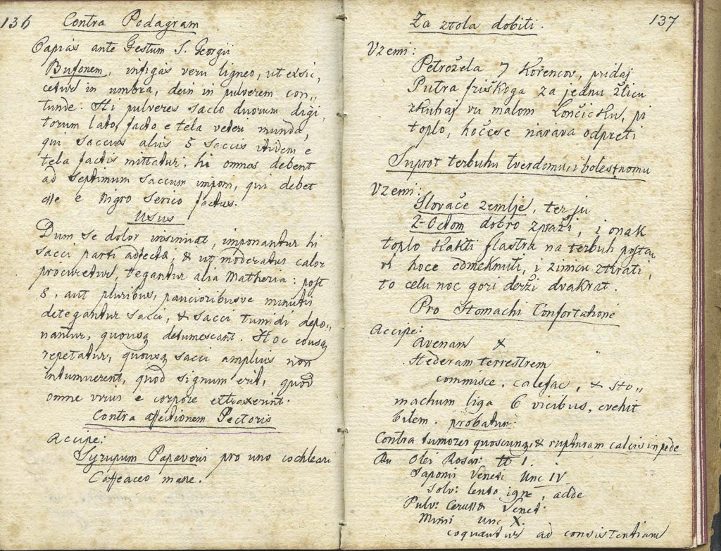 Večji del receptov in navodil je v latinščini.