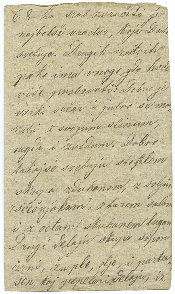 Proti kukcu (domnevam, da gre za zanohtnico, ognojek na prstu, ki so ji včasih rekli tudi črv): Canjek vu žganici namoči, vužgi te onak toplo povečput na perst deni, vmori kukca (izžiganje? op. M.O.). Sledi podčrtana pripomba Probatum, kar najbrž pomeni “preizkušeno”. Drugi recept za isto težavo je sledeč: Eden ali dve lule dobroga tobaka opuši, pepel taj očuvaj, zmesi ga z dobrim droždjenicmi (?) i persta bolečega obveži, naj bude gori, dok kukec pogine, kaj dugo čakati ne bi moral. Probatum.