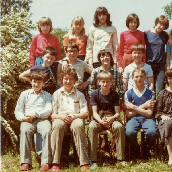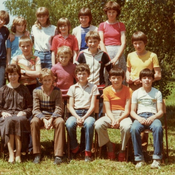 Na šolskem vrtu med zelenjem, se je v šolskem letu 1981/82 slikal 6. c razred s svojo razredničarko Magdo Mele.