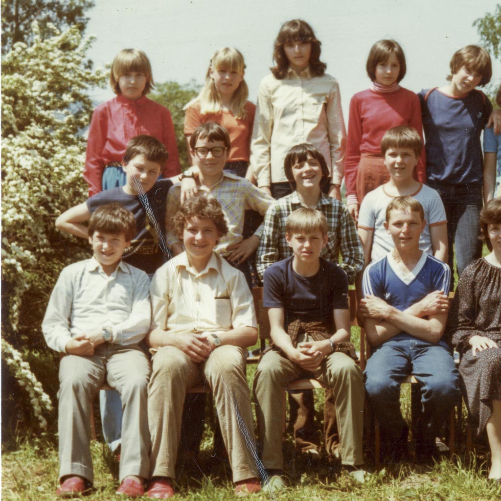 Na šolskem vrtu med zelenjem, se je v šolskem letu 1981/82 slikal 6. c razred s svojo razredničarko Magdo Mele.