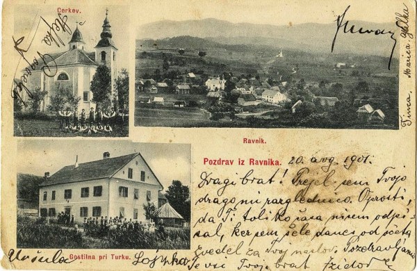 Na sprednji strani razglednice so podobe takratnega Ravnika: cerkev, gostilna pri Turku in pogled na vas; na hrbtni pa drobna, a topla beseda med bratoma. Preprosto, skoraj vsakdanje sporočilo, razkriva domačnost časa, ko so vezi med domačimi in tistimi v vojski ohranjale kratke razglednice in rokopisne misli.