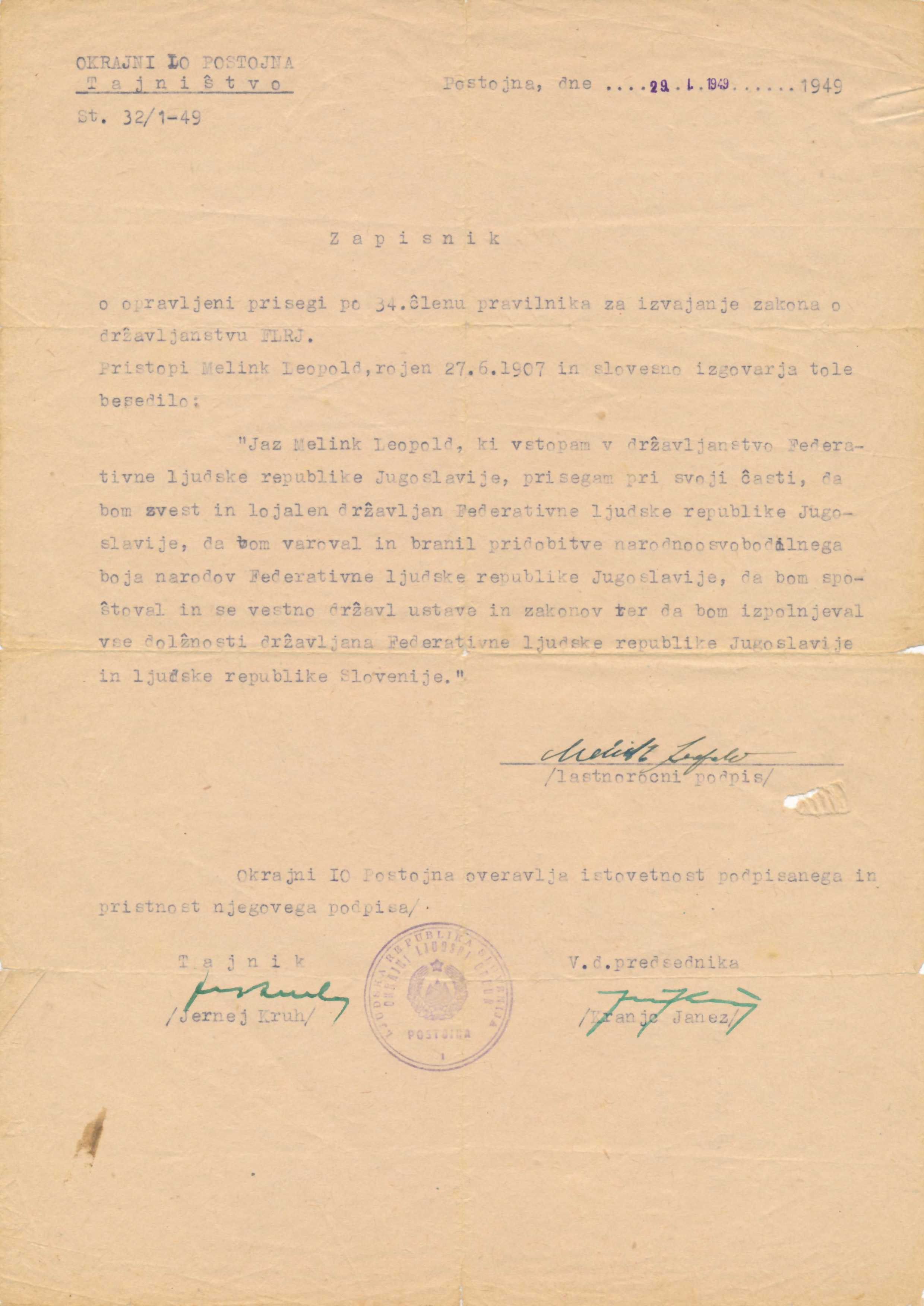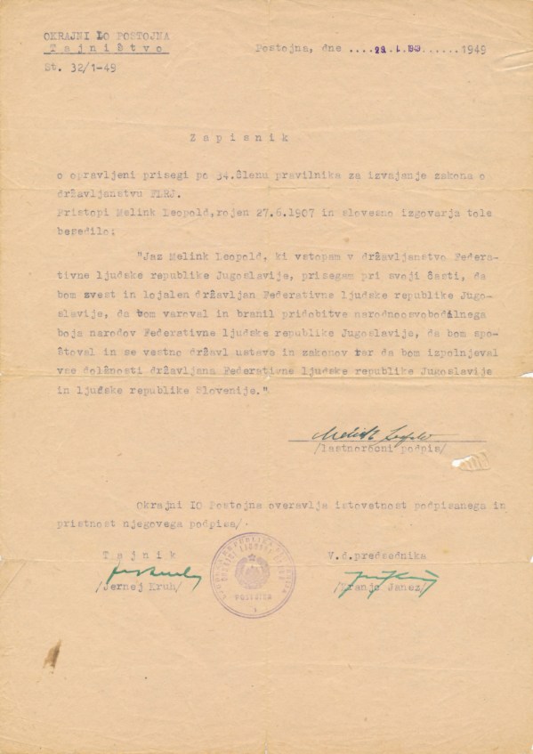 Jaz Melink Leopold, ki vstopam v državljanstvo Federativne ljudske republike Jugoslavije, prisegam pri svoji časti, da bom zvest in lojalen državljan Federativne ljudske republike Jugoslavije, da bom varoval in branil pridobitve narodnoosvobodilnega boja narodov Federativne ljudske republike Jugoslavije, da bom spoštoval in se vestno držal ustave in zakonov, ter da bom izpolnjeval vse dolžnosti državljana Federativne ljudske republike Jugoslavije in Ljudske republike Slovenije.