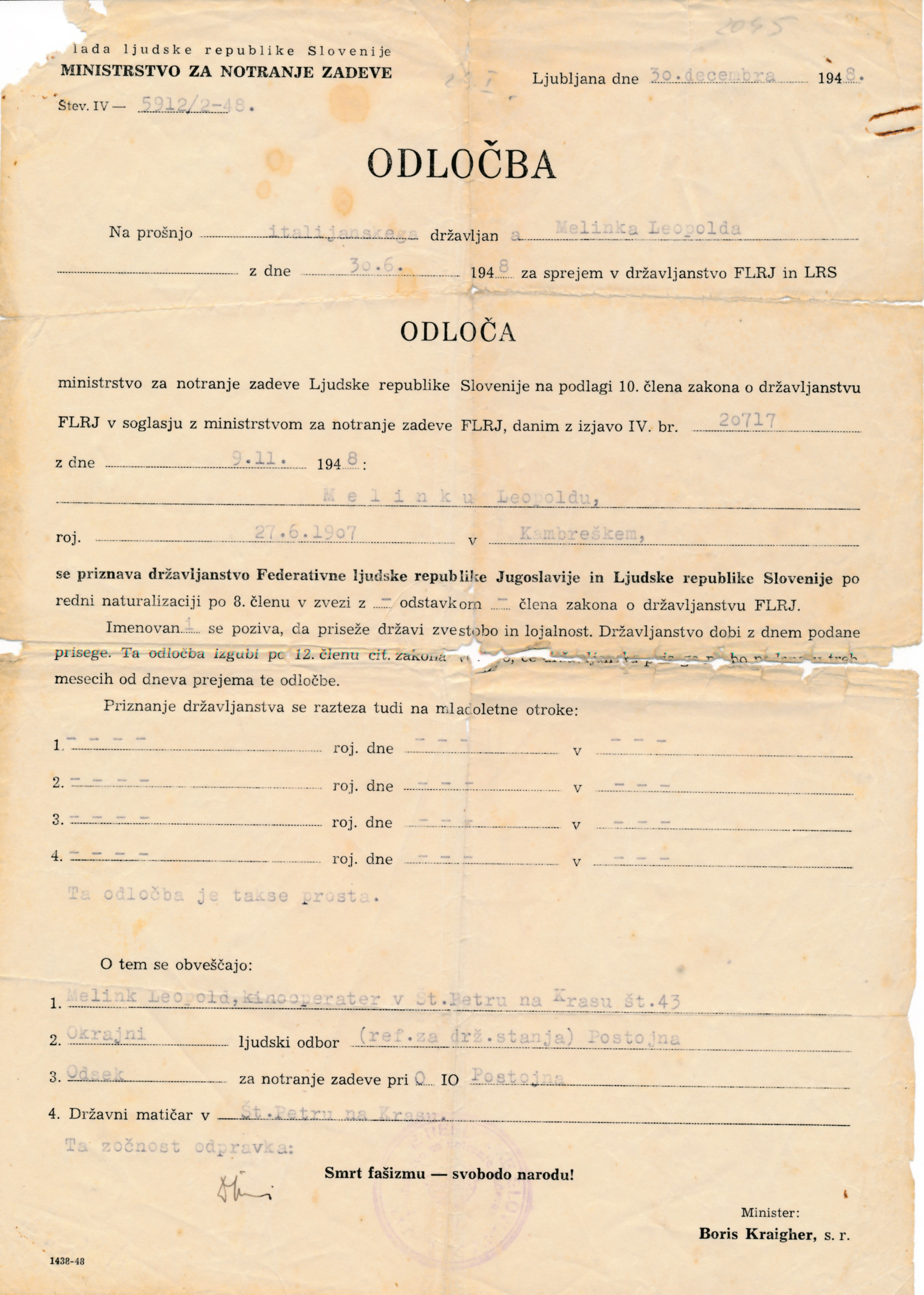 1949 Postojna – Državljanstvo