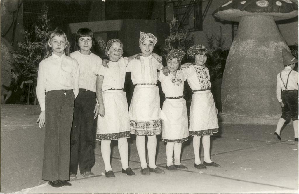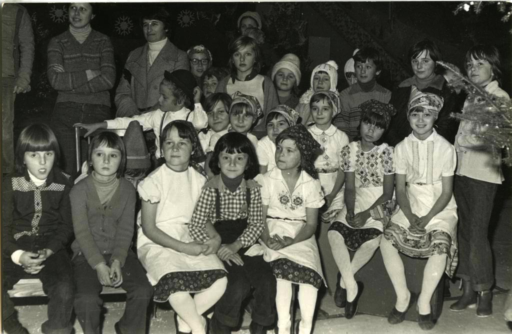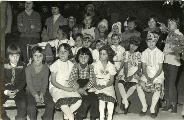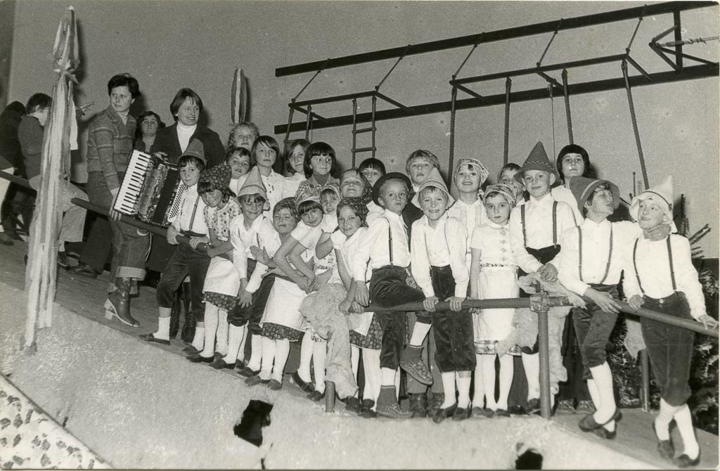 Telovadnica je bila temu primerno okrašena. Vidimo novoletne jelke in veliko gobo mušnico. Učiteljica Ivanka Štrukelj je poučevala razredni pouk in vodila folklorno skupino. Pevske zbore je vodila učiteljica glasbenega pouka Gertruda Zigmund, ki je vse skupaj spremljala z igranjem na harmoniko. Folklorna skupina je bila trenutku primerno tudi oblečena. Rutke, zavezane na tilniku, lepe srajčke, krilca in predpasniki pri deklicah ter pumparice in kape v stilu Kekca pri dečkih. Vodja folklorne skupine Ivanka Štrukelj je poskrbela za ta lepa oblačila. Kupila je blago in ga dala šivilji Miri Homovec, ki se je res potrudila pri izdelavi. Vsi učenci so nestrpno čakali na svoj nastop. Otroci takrat še niso poznali veselega decembra, bilo pa je praznično vzdušje med božičnimi in novoletnimi prazniki, v pričakovanju Božička in Dedka Mraza.
