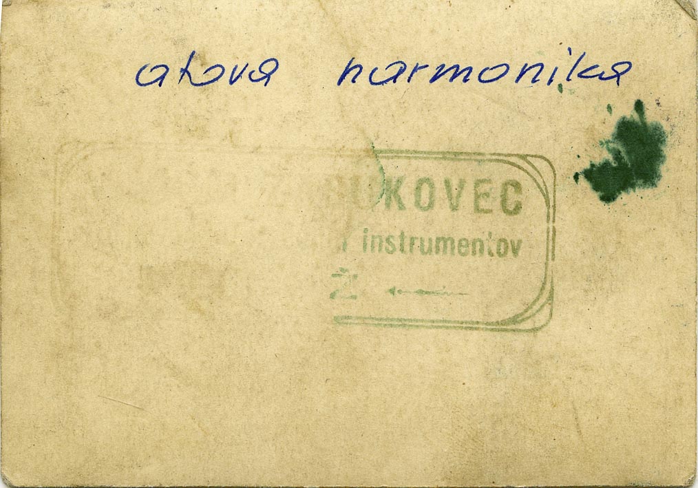 Na zadnji strani te fotografije se je ohranil odtis dela žiga, ki ga je uporabljal pri izdelavi harmonik.