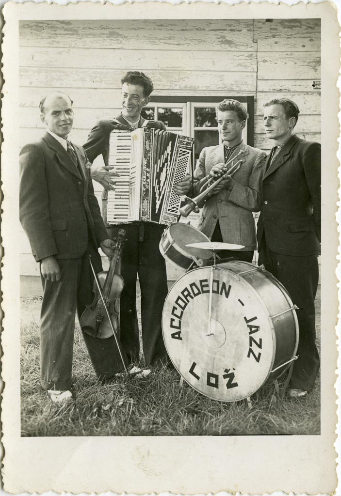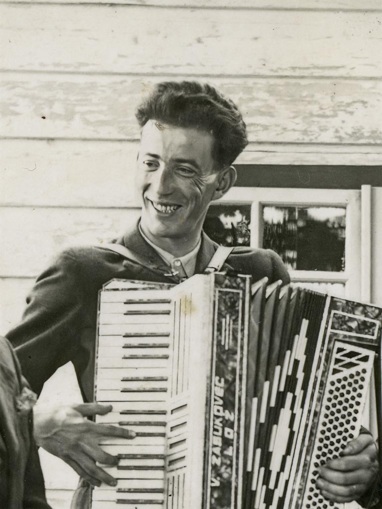 Vilkotov ansambel Accordeon Jazz, slikan pred leseno stavbo, ki so ji rekli Vilkotova baraka. Viljem je na sliki s harmoniko.