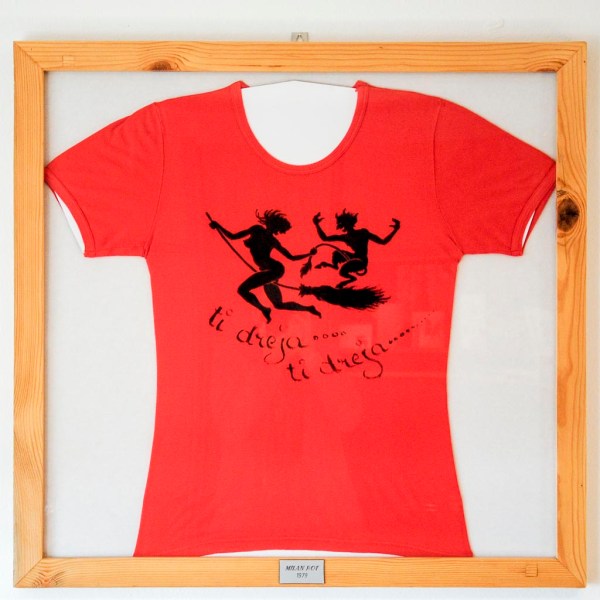 Kdaj in kako se je porodila ideja, da mi na majico nariše čarovnico s hudičem, se ne spomnim. Pa saj to ni niti toliko pomembno – dobre ideje je treba uresničiti. Prinesel sem mu novo majico in Milan se je lotil dela. Ko sta bila »čarovnica« in hudič narisana, pa je dodal še napis »ti dreja ti dreja«, po slovenski narodni pesmi.