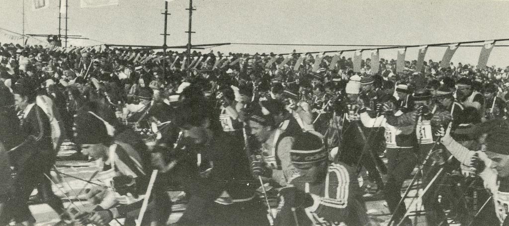 Po uvodni slovesnosti in prižigu ognja pred šolo so startali tekači na 9. bloških tekih. Če je bilo zjutraj še megleno, pa je bil ob startu že čudovit zimski dan. 40 cm snega, -7 stopinj, 1616 udeležencev teka! Na 7 km – trim tek 322 udeležencev, na 15 km – Dakijev tek 407 udeležencev in na 30 km – Bloški tek 867 udeležencev. Slika da slutiti nervozo ob masovnem startu. Prepletene smuči in palice, padci in vpitje, a počasi so se tekači le utirili v smučine in se spopadli z lepimi progami. Hvala bogu tek v drsalnem koraku še ni bil izumljen, sicer bi bil start še bolj kaotičen. S časom 1 ura 12 min 11 sec je na 30 km progi zmagal Tomaž Kalan iz Radovljice. Jaz sem s časom 1 ura 49 min 43 sec dosegel 311 mesto med 620 moškimi na 30 km. Tako je to bilo. Le nekaj minut sem zaostal za mojimi najboljšimi časi iz leta 1979 in 1981, ko smo stanovali še v Loški dolini in sem tam lahko treniral z zagrizenimi Ložani.