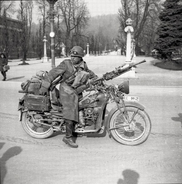 Italijanski motorist ob italijanski okupaciji. Park Tivoli, Ljubljana 12. aprila 1941. Foto Miran Pavlin.