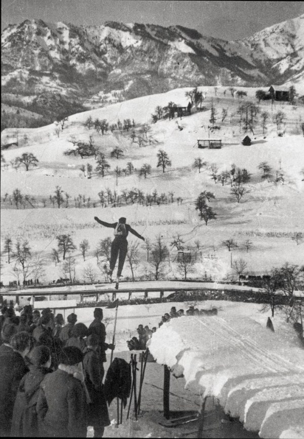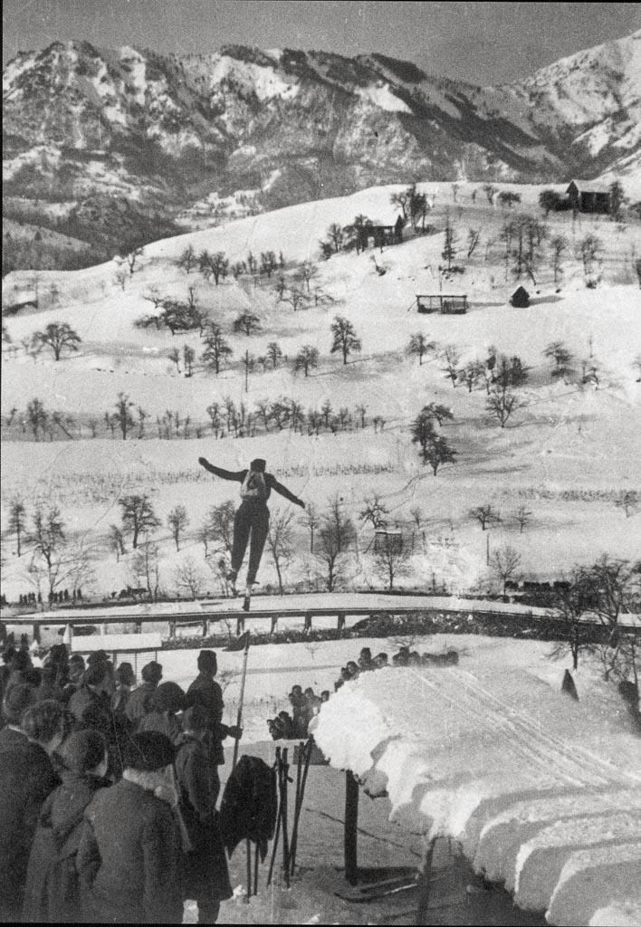 V Cerknem so 20. In 21. Januarja 1945 priredili smučarsko tekmo. Tekmovali so predvsem borci Prešernove brigade, in sicer v teku patrulj, veleslalomu in skokih. Foto M. Masterl.