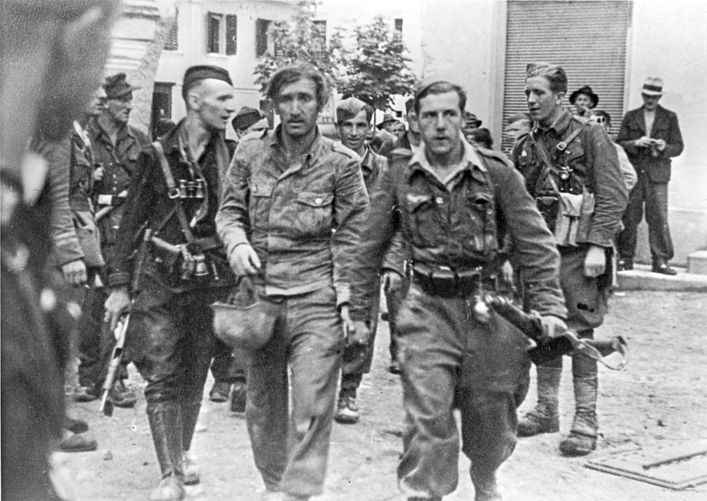 Šlandrovci z ujetim nemškim vojakom po boju za Ljubno, 31. julija 1944. Foto Stane Lenardič.