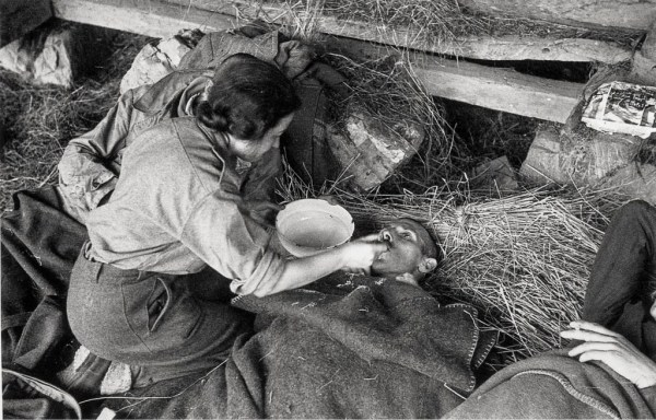 Hranjenje ranjenca, Srednja vas poleg Črmošnjic avgusta 1944. Foto Božidar Jakac.