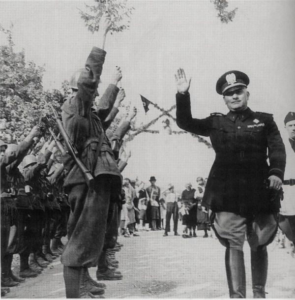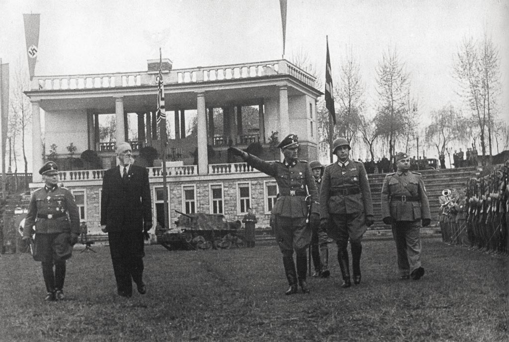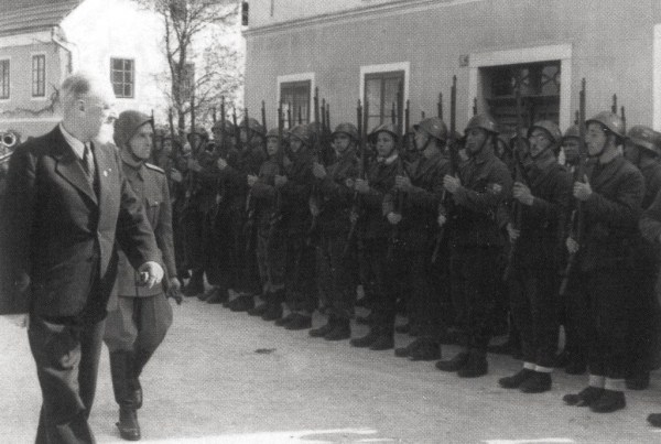 N. N. Leon Rupnik si na obisku v Logatcu ogleduje postrojene domobrance, poleti 1944.