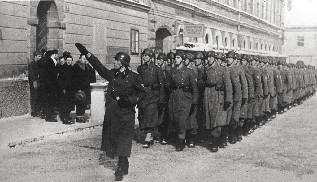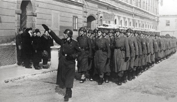 N. N. Prisego Hitlerju so domobrancu dali tudi 30. 1.1945. Domobrance v Ljubljani vodi nemški častnik.