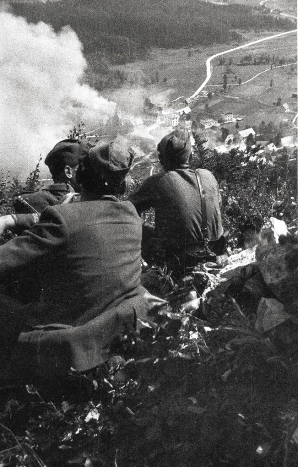 Člani 9. korpusa na položajih nad Črnim Vrhom nad Idrijo med napadom 1. septembra 1944. foto Čoro Škodlar.