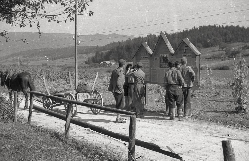 Stenčas in oglasna deska propagandnega odseka okrožja OF Novo mesto, september 1944. Foto Maksimilijan Zupančič.