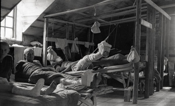 Notranjost barake za ranjence v bolnišnici Ajdovec, Kočevski Rog, 1944. Foto dr. Janez Milčinski.