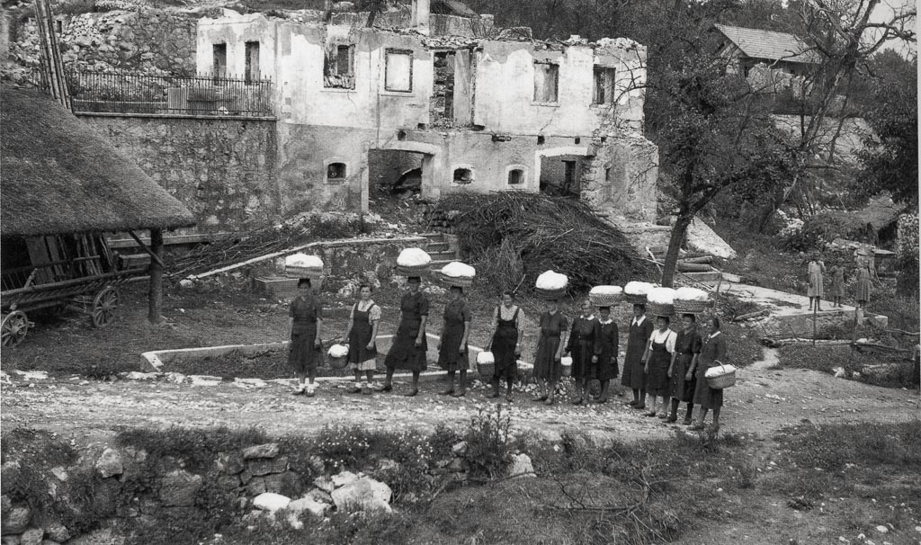 Vaščanke iz Bojanje vasi nesejo ranjencem priboljške, Bela krajina, pomladi 1944. Daro Kopinič.