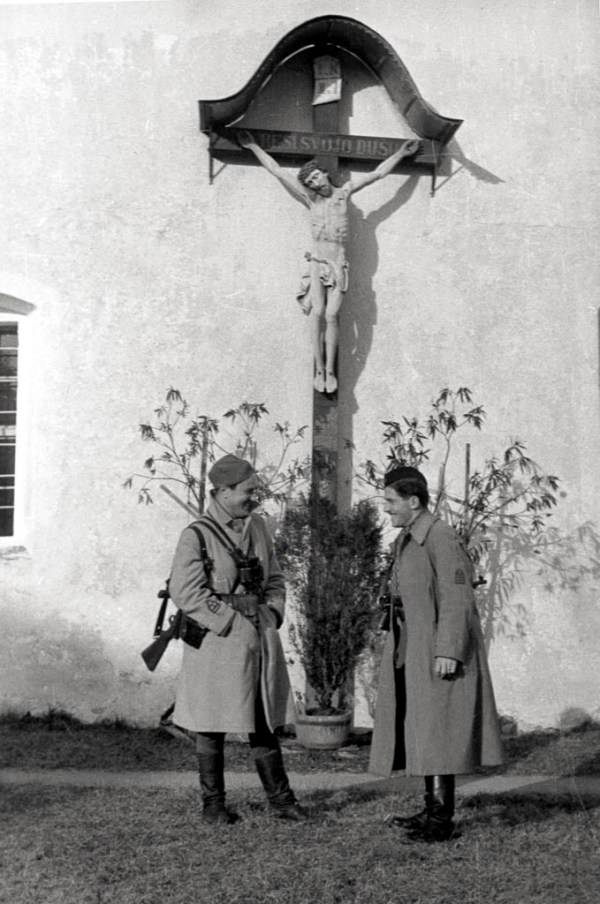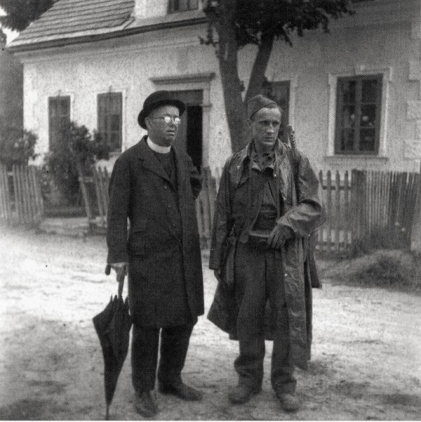 Župnik Josip Pravhar iz Loškega Potoka s fotografom Francem Cerarjem v Starem trgu pri Ložu, septembra 1944.