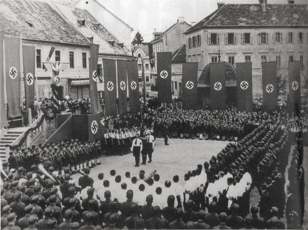 N. N. Nemški okupator je svojo oblast manifestiral na pogostih zborovanjih ob številnih praznikih, ki jih slovensko prebivalstvo sploh ni poznalo, Ptuj aprila 1941. Pokrajinski muzej Ptuj
