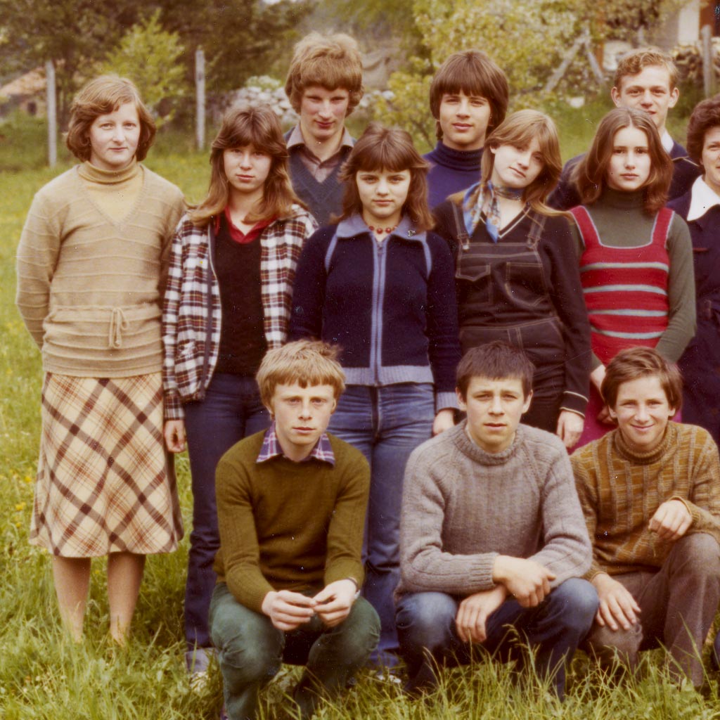 Osnovna šola Rakek in 8. a razred v šolskem letu 1979/80. Razredničarka je bila Danica Štefančič, pridružila se jim je še mlada učiteljica Antonija Meden.