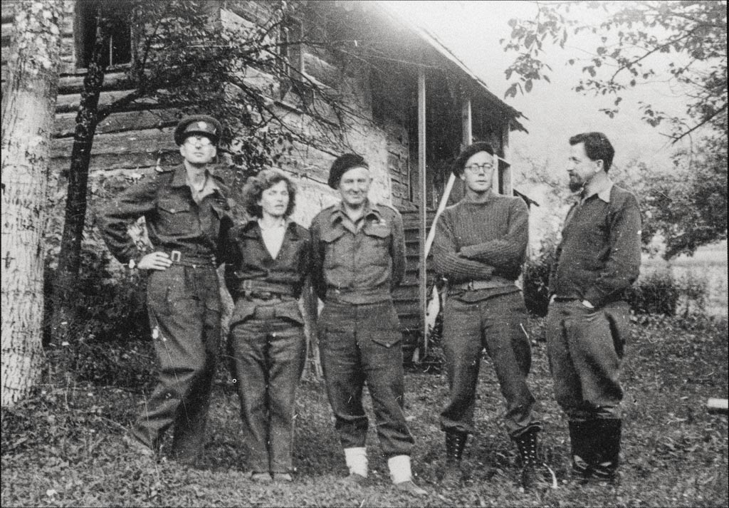 Vojni dopisnik BBC Matthews, Nada Kraigher, dr. Lindsay Rogers, angleški radiotelegrafist in Božidar Jakac, Srednja vas poleg Črmošnjic avgusta 1944. Foto Božidar Jakac.