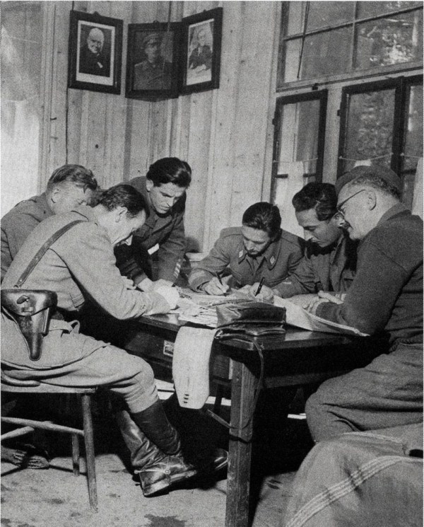 John Phillips: Načrtovanje napada na litijski most v GŠ slovenske partizanske vojske. Pri mizi stoji komandant general Franc Rozman – Stane. Po načrtu naj bi poslali tri brigade v Litijo, kjer naj bi napadle nemško garnizijo in razstrelile železniški most. Na steni so portreti Churchilla, Stalina in Roosevelta, september 1944.