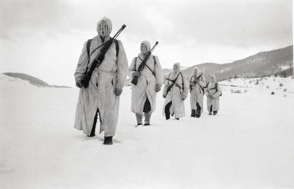 Edi Šelhaus: Belo maskirana partizanska izvidnica v snegu nekje pod Snežnikom, pozimi 1944/45.