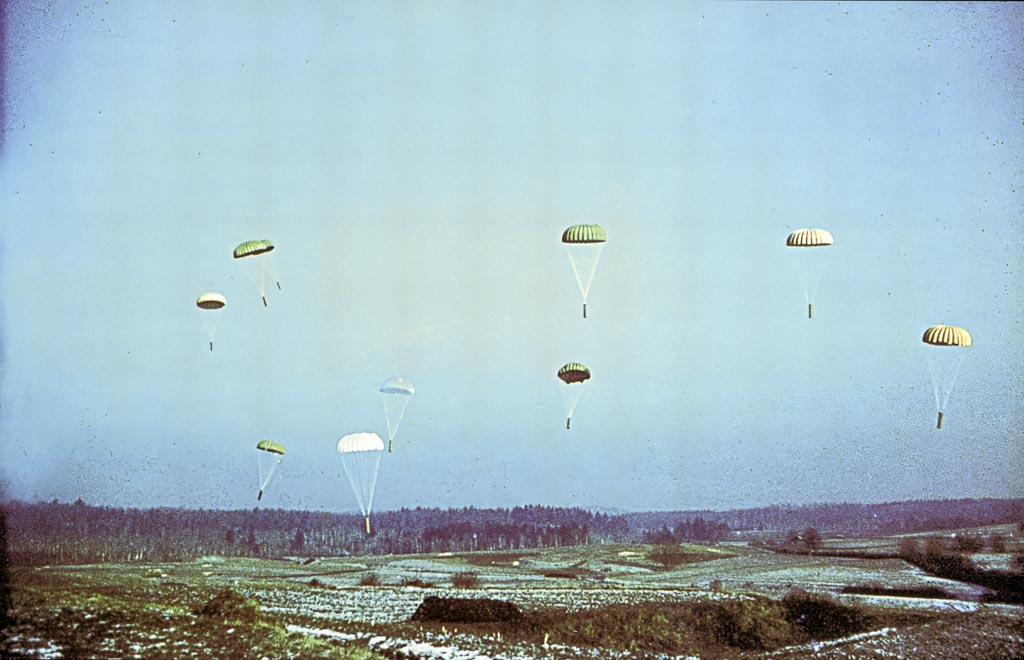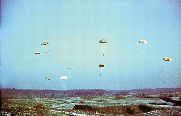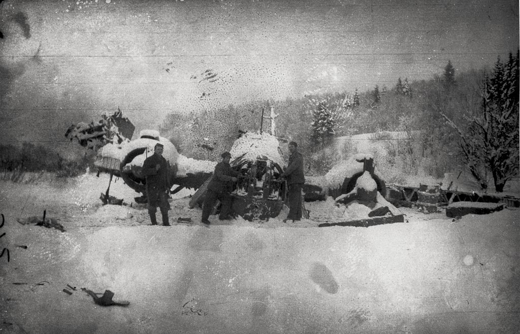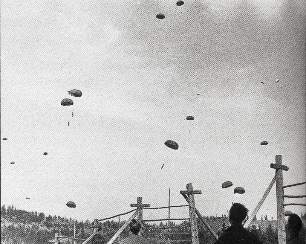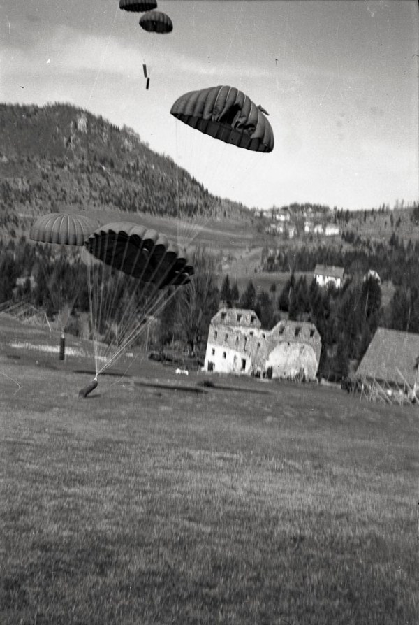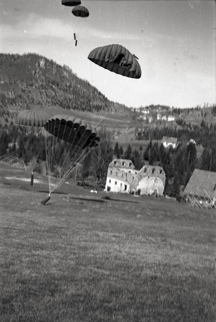 Vojsko, 8. april 1945. Zavezniška letala so odvrgla orožje in hrano na Vojskarsko planoto. Večji del padala z zabojniki je pristal na čistini. Foto Sandi Jesenovec.