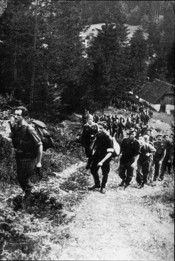Jože Petek: Kolona prebeglih vojnih ujetnikov (v glavnem iz Avstralije, Nove Zelandije in Velike Britanije) in partizanov – spremljevalcev – borcev Pohorske čete Lackovega odreda na poti skozi Savinjsko dolino, začetek septembra 1944. V ospredju na fotografiji so z leve proti desni: Franc Gruden – Švejk, Karel Čolnik – Kolo, Franjo Vesenjak – Franček, Ralph Churches in Les Laws. Muzej narodne osvoboditve Maribor.