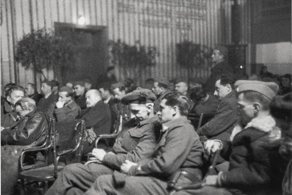 Novozelandci in partizani pred razbitim sodiščem, Trst, 2. maja 1945. Foto Mario Magajna. Narodna študijska knjižnica Trst
