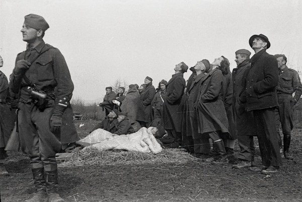 Ranjeni partizani opazujejo pristajanje zavezniških letal, Griblje pri Črnomlju marec 1945. Foto Franjo Veselko.
