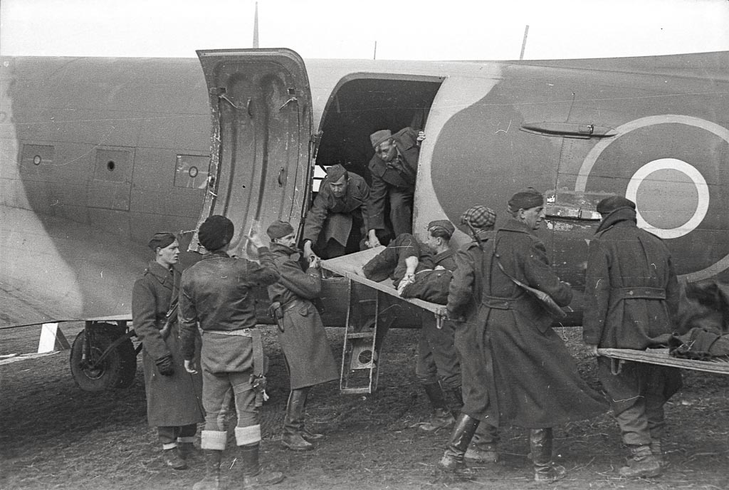 Vkrcavanje ranjencev na zavezniška letala za prevoz v Bari, Črnomelj, marec 1945. Foto Franjo Veselko.