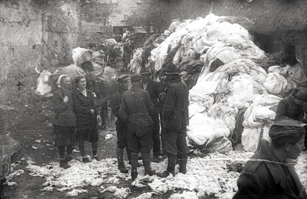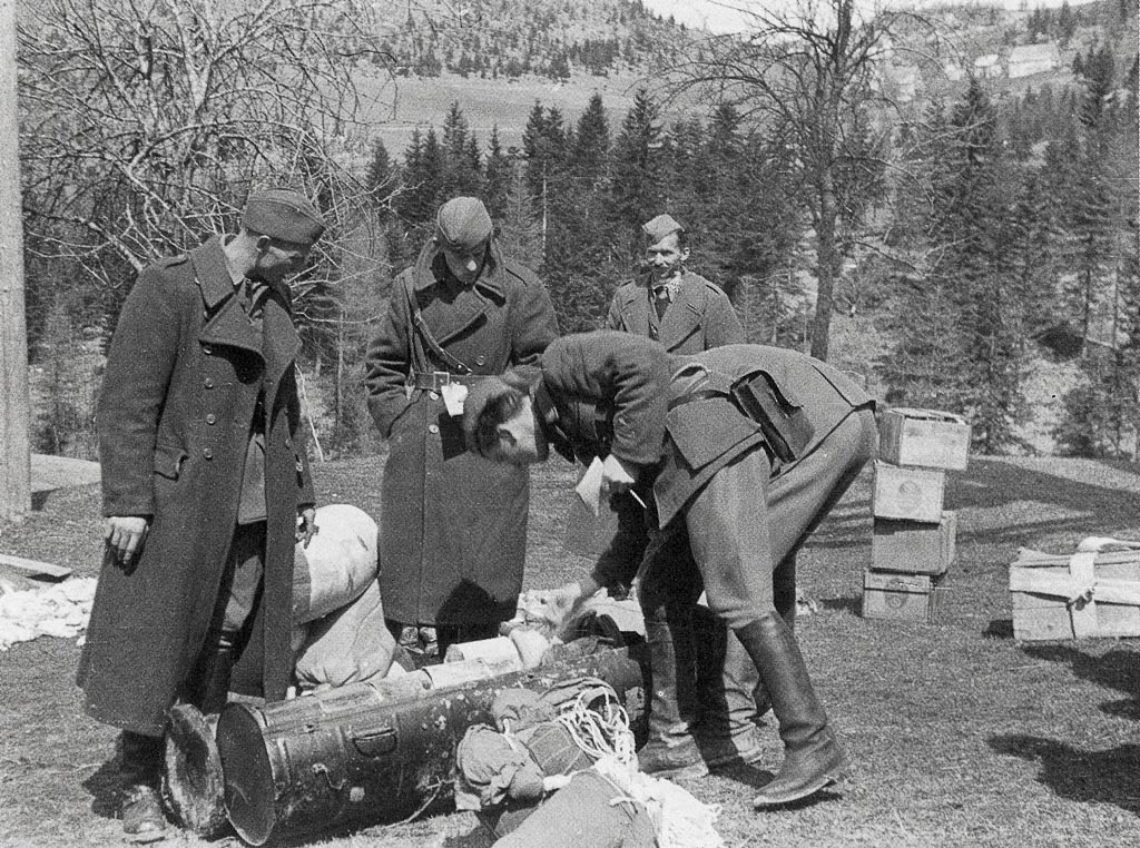 Pregledovanje materiala, ki so ga odvrgli zavezniki, Cerkljansko 1945. Foto Marijan Masterl.