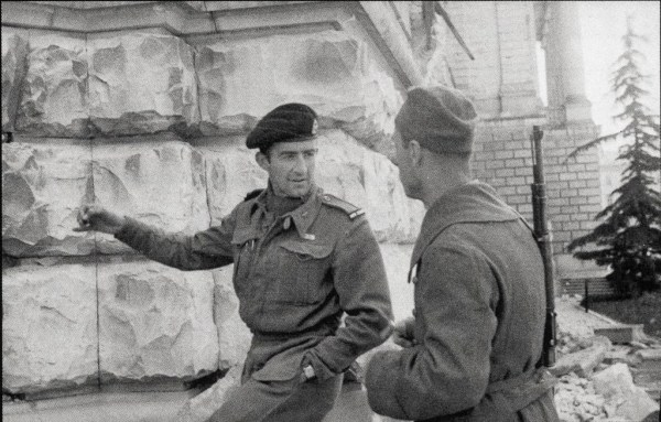 Angleški oficir v pogovoru s partizanom, Trst 2. Maja 1945. Foto Rudi Vaupotič.