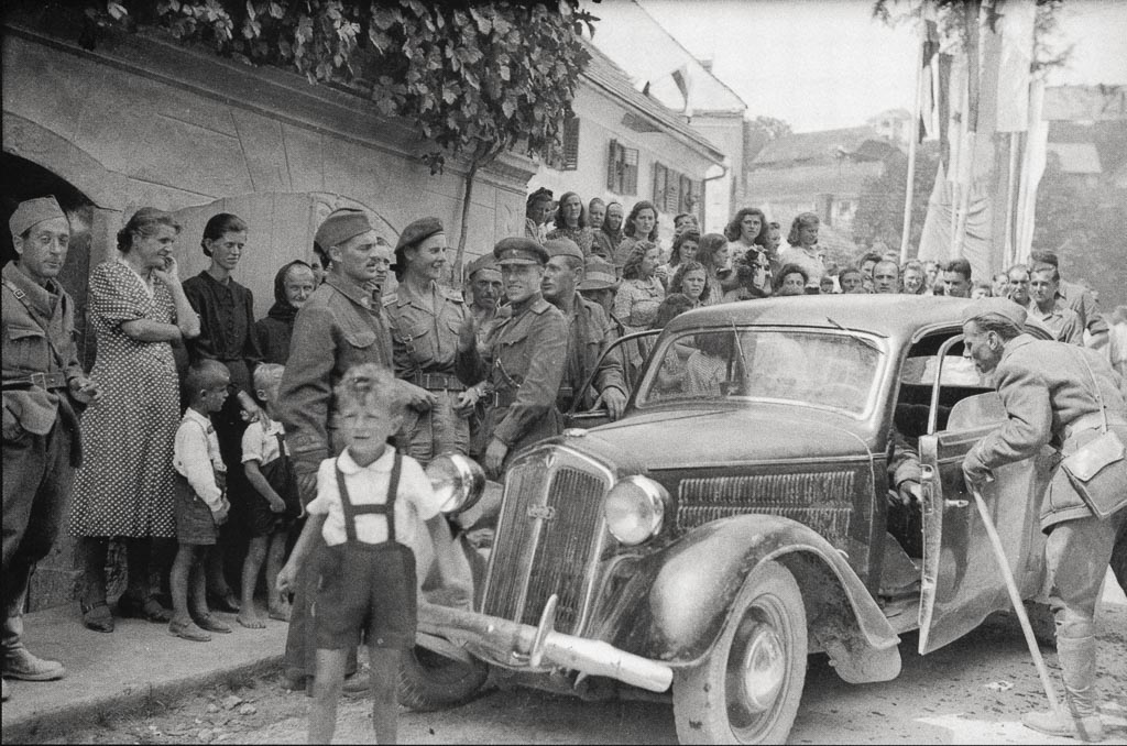 Prihod ameriške in sovjetske vojaške misije na proslavo ob prazniku slovenskih in hrvaških partizanskih enot, Metlika 9. julija 1944. Foto: Daro Kopinič.