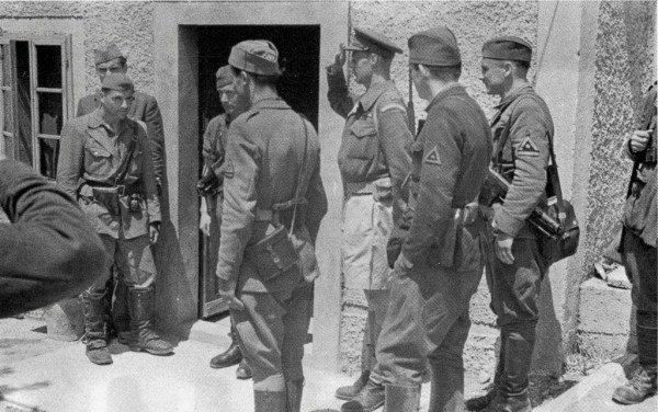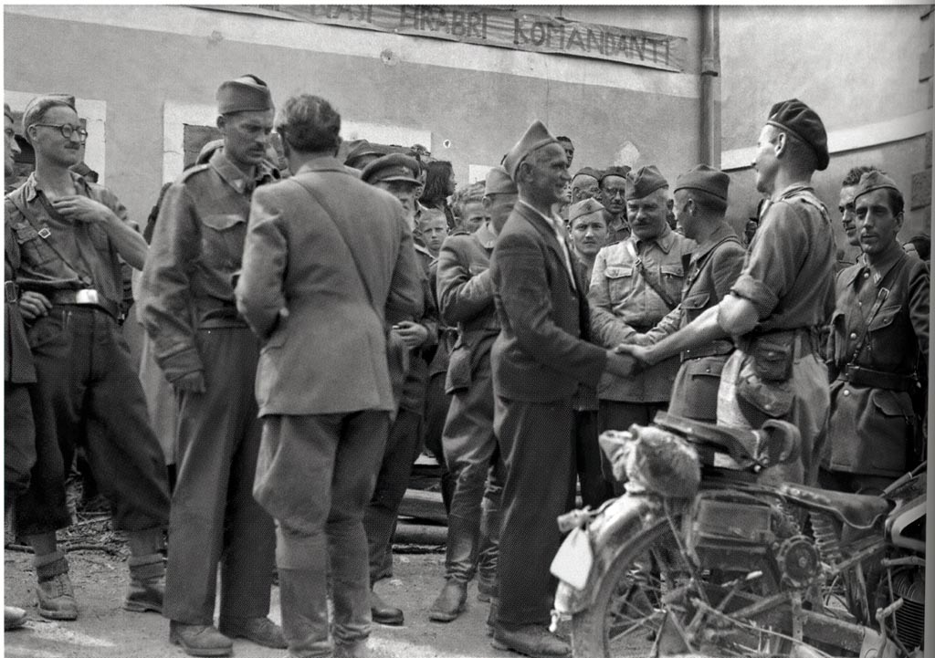 Partizani ob sprejemu zavezniške misije v Metliki 22. marca 1945. Foto Edi Šelhaus