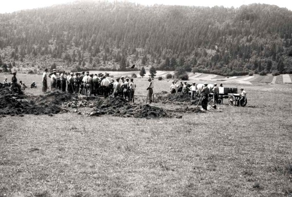 Planiranje Nadleškega polja za partizansko letališče Nadlesk v Loški dolini junija 1944. Foto Vinko Bavec.