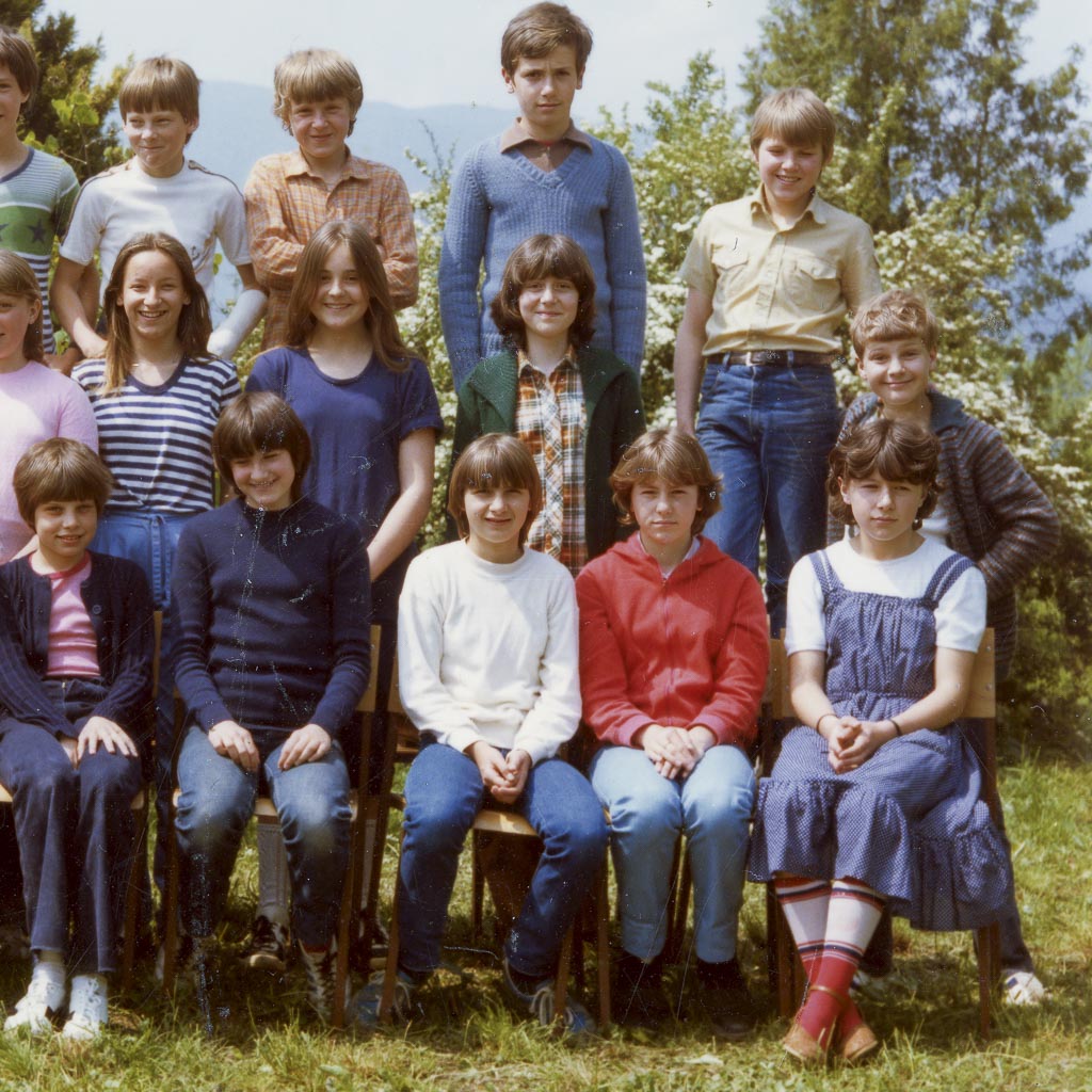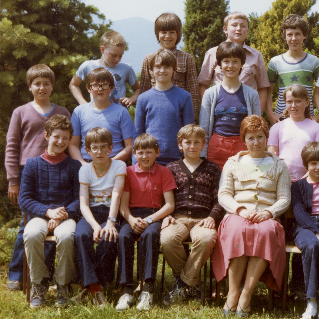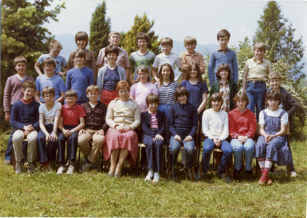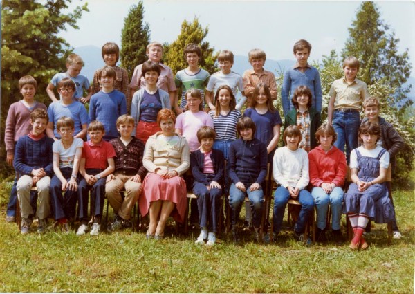 Na šolskem vrtu ob osnovni šoli v Cerknici, se je v šolskem letu 1981/82 slikal 6. a razred in razredničarka Cvetka Levec.