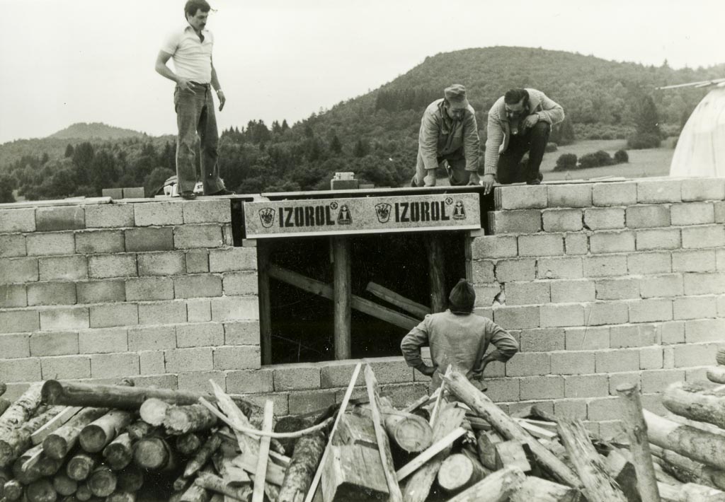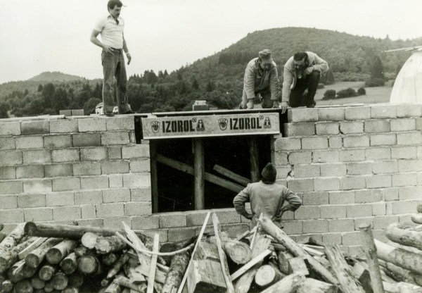 Sodelavci iz razvoja iz Loža smo prve montaže omaric IZOROL opravili in nadzirali osebno. Kot kaže današnja slika, smo pri gradnji hiše sodelavca Toneta Plosa v Markovcu tako sodelovali: Tone, v kapi, obrnjen s hrbtom proti fotografu, na nedokončanem opažu prve plošče pa smo jaz, takrat vodja razvoja in danes pisec tega prispevka, Tonetov brat Vinko iz Viševka, ki je bil pri nas sicer orodjar, a tu kot zidarski mojster in Jože Troha, takrat dir. TOZD Orodjarna, kamor je spadal tudi naš razvojni oddelek. Na opažu (fršolengi) je seveda nepogrešljiva štilarca. Gradbišče je zasuto s puntami najbrž pripeljanimi z drugega gradbišča. Iz betonske opeke je zgrajen kletno-pritlični del hiše.
