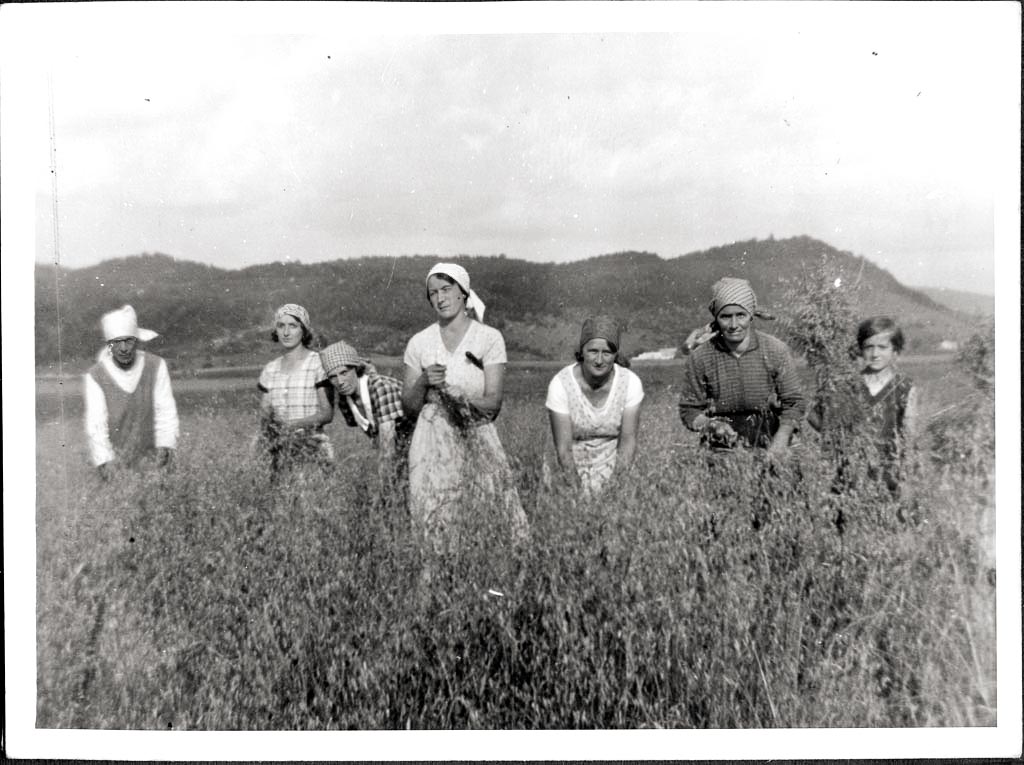 Slika žanjic je iz spominskega albuma Babnopoljcev, namenjenega sovaščanom, ki so leta 1946 kot kolonisti odhajali na Štajersko. Zadaj desno je na sliki Vražji Vrtec, proti levi pa Reber, Gmajna in Jurčov grič. Pepca Strle meni, da je mogoče četrta ženska od leve Pirkina Mica, ostale ostajajo neprepoznane … Ob tej sliki sem enkrat že pisala, čeprav sem o njej vedela še manj kot zdaj.