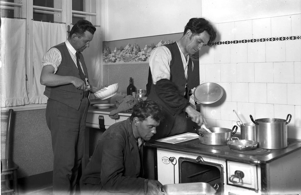 V današnjih časih bi rekli fotografiji »fake news« (lažna novica). V tridesetih letih dvajsetega stoletja je bila kuhinja izrecno v ženski domeni. Fantje so se nastavili fotografu le zaradi poziranja. Nastala je prav simpatična fotografija. Karol Naglič v porcelanasti skledi nekaj stepa z metlico, ki ji doma pravimo šiba. Karel Humar meša zrak na štedilniku, Ciril Gostič pa rine prazen protfan v ror. Humar ima na rokah črne narokavnike. Take so nosili uradniki, da si niso popackali belih rokavov s tinto. Pralnih strojev še ni bilo. Da bi belo ostalo belo, je bilo potrebno natančno in dolgotrajno pranje, kar se ni dogajalo vsak dan.