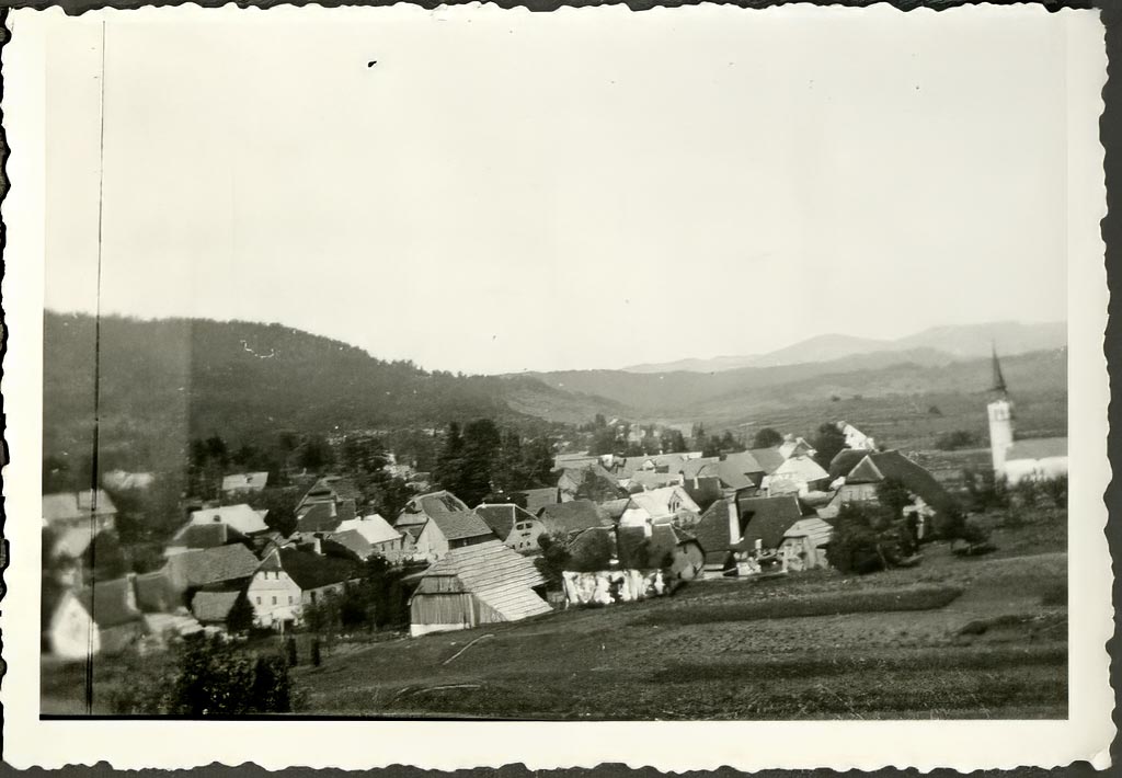 Pogled na domačo vas štajerskih preseljencev, nadvse mila podoba: Babno Polje z Otročjega hriba, z juga. Levo so babnopoljski gozdovi, desno cerkev sv. Miklavža / Nikolaja, spredaj nekaj njiv, v ozadju hribi proti Babni Polici …