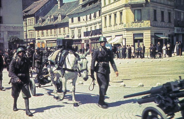 Italijanska okupacijska vojska, Ljubljana, april 1941. (barvni dias). Foto Jakob Prešeren. Barvne filme za diapozitive so Prešernu poslali sorodniki iz ZDA.