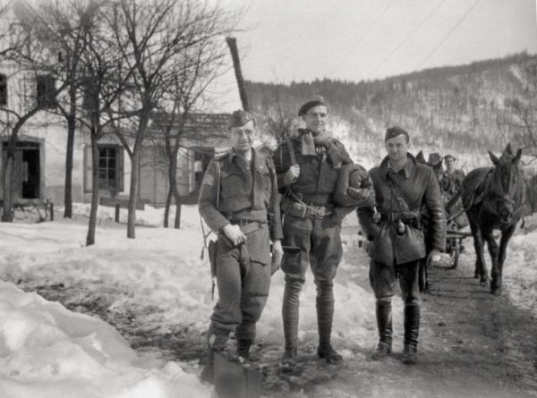 Angleški pilot (v sredini), ki so ga pred okupatorjevim zajetjem rešili domačini in partizani, na poti skozi Črmošnjice, 1945. Na levi je poročnik George Wuchinich, vodja ameriške obveščevalne misije pri Glavnem štabu NOV in PO Slovenije. Foto Edi Šelhaus.