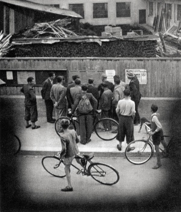 Okupator je razobesil letake z imeni ustreljenih talcev, Jesenice 1941. Foto Slavko Smolej. Smolej je fotografijo skrivaj posnel z okna.
