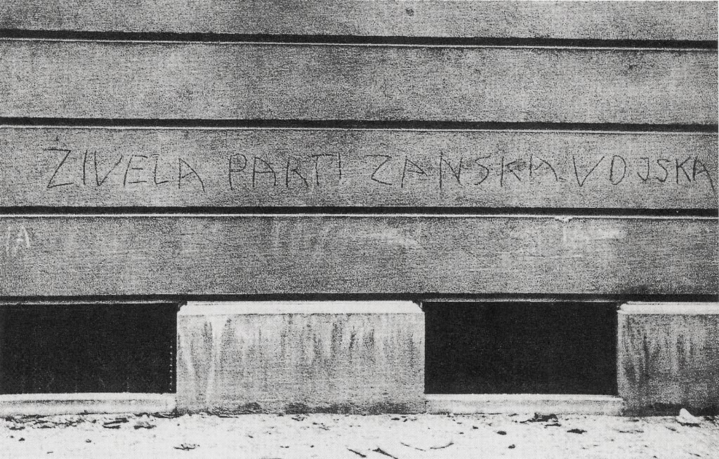 Napis na nekem poslopju v Ljubljani, 26. oktober 1941. Foto Miran Pavlin. Odporniške napise je Pavlin dokumentiral zgodaj zjutraj ali pa proti večeru, preden so napise izbrisali.