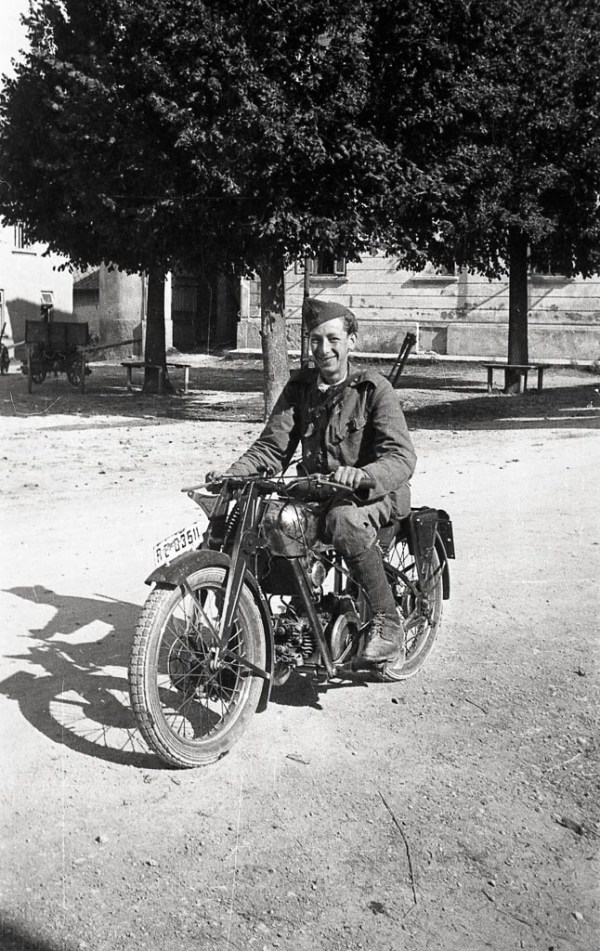 Kurir Notranjskega odreda na motorju v Ložu avgusta 1942. Foto Vinko Bavec. Netipična fotografija kurirja in to celo z motorjem. Kurirji so v glavnem hodili peš čez hribe in doline. V najboljšem primeru so imeli kolo. To je bil tudi čas, ko se je začela vzpostavljati razvejana kurirska organizacija.