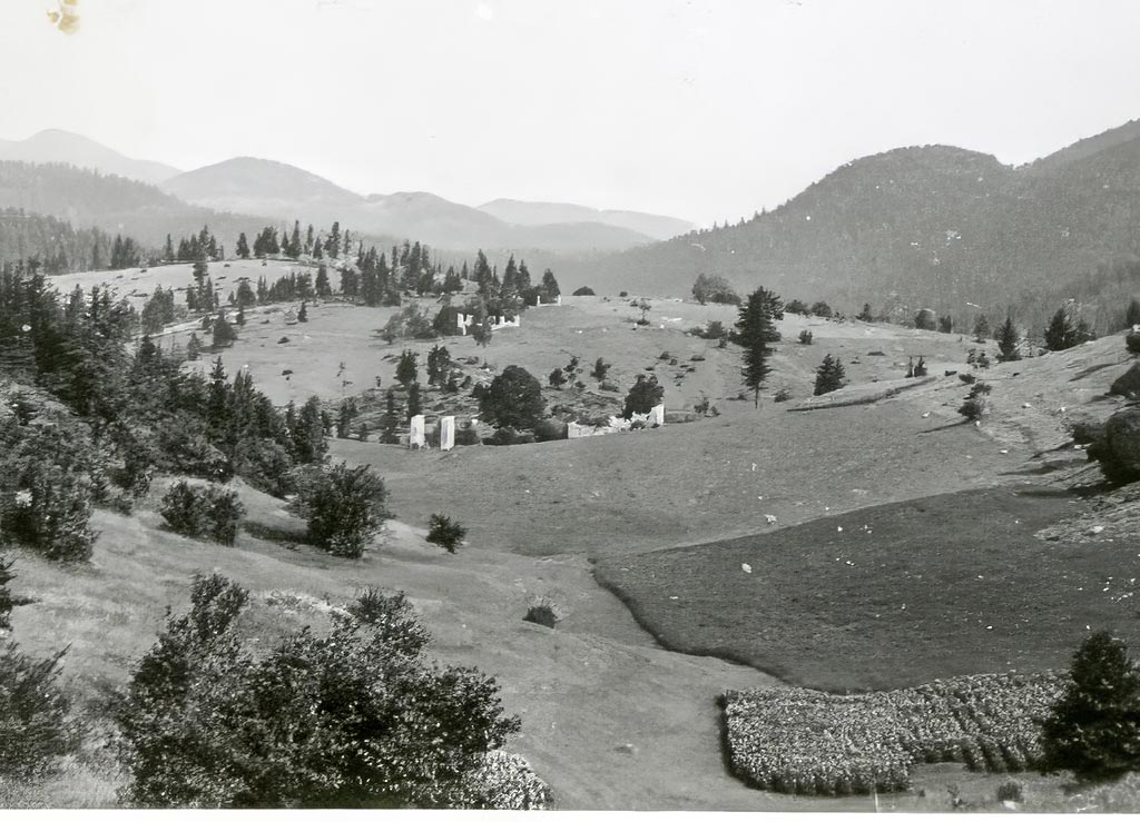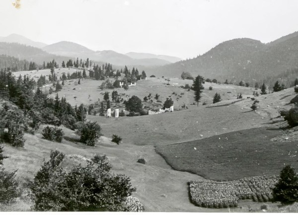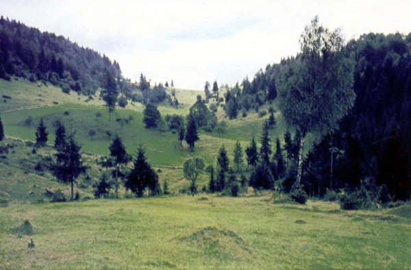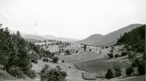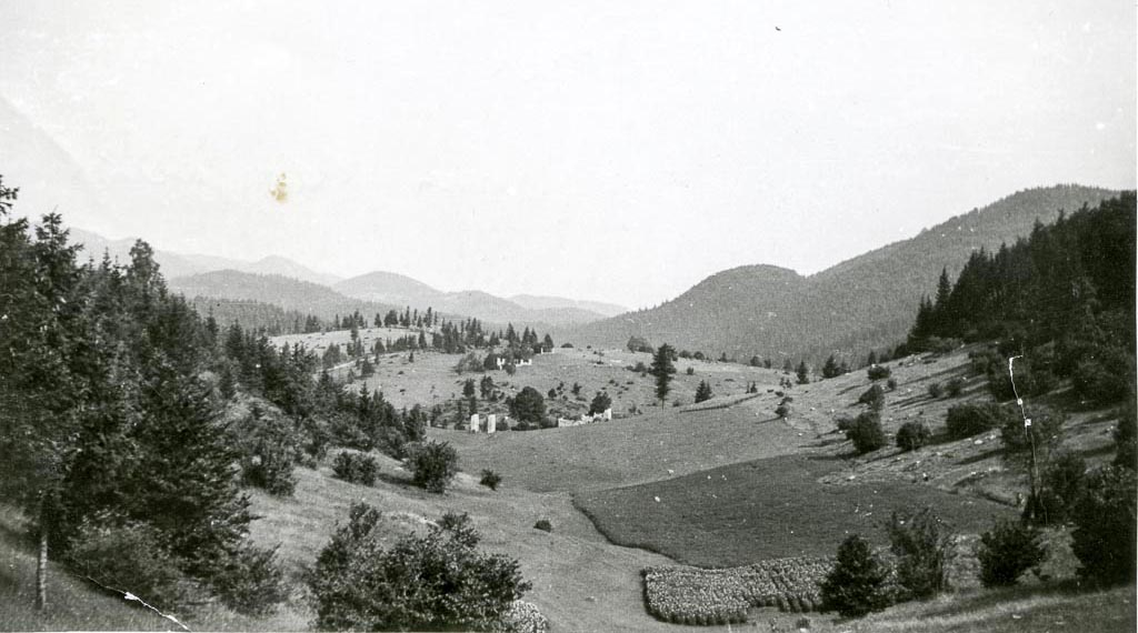 Glede na poraščenost z drevjem sklepam, da je fotografija nastala v zgodnjih sedemdesetih letih. Ata je zelo pazil, da se travniki ne bi zarasli z drevjem. Danes gozdna meja sega do njiv. Domnevam, da je fotografijo posnel Franc Mihelič. Slikal je od Podleščeve domačije proti Vrzelu. Prejšnja pa je bila posneta ravno obratno. Vrzel je skrajni ravni del v ozadju. Na drugi strani Vrzela je Žrvampova domačija.